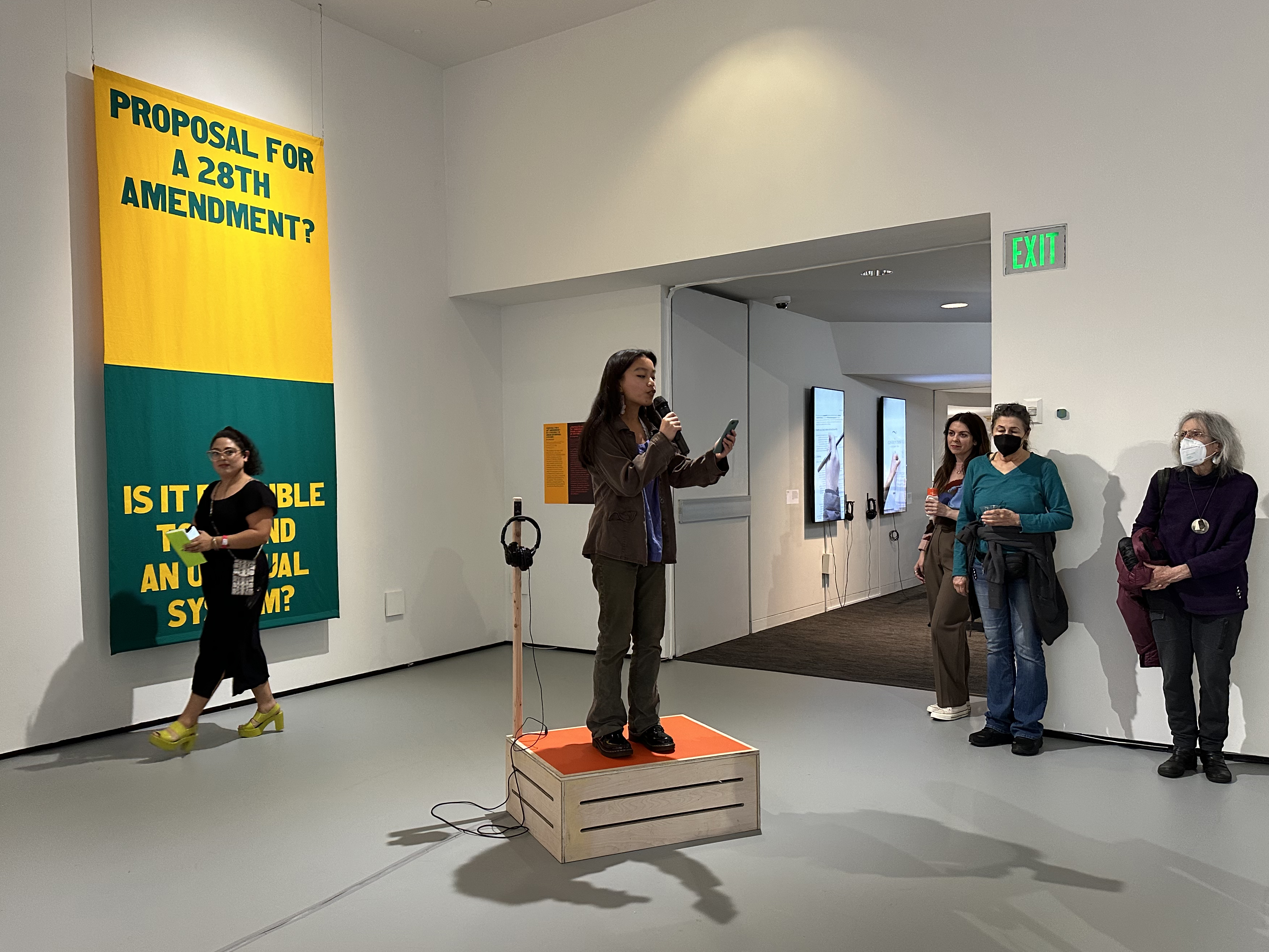 Proposal for a 28th Amendment? Is it Possible to Amend an Unequal System?, collaboration with Tali Keren, 2021-2025 (SF iteration 2022-2023), participatory installation made of sonic soapbox sculptures with MP3 players and headphones that emit evolving oral archive, recording station, eight 4K videos and four 60x120” canvas banners, curated by Martin Strickland and Amy Kisch, Yerba Buena Center for the Arts, San Francisco, CA